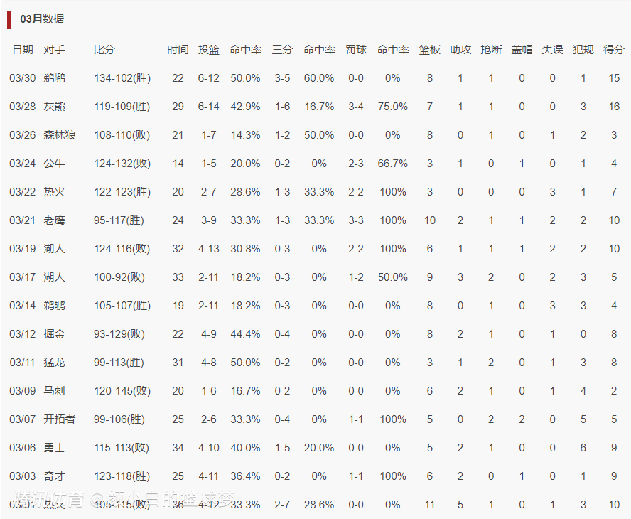 伊森整个三月份单场最高分是16分,此役是单月第二高分,但此役命中率50%+三分命中率60%,伊森三月最多一场的三分就是这场,伊森的归位对于火箭来说太重要了。