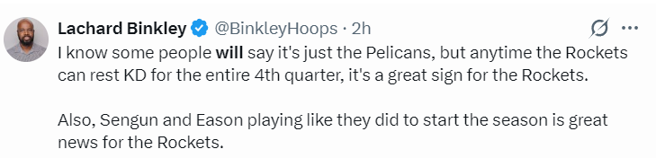 赛后火箭队记兰德里-宾克利写道:我知道有些人可能会说是打羸弱鹈鹕的关系,但只要火箭能够让杜兰特在第四节获得足够长的休息时间,这对于火箭来说就是一个非常好的信号。此外,申京/伊森在终于开始发挥出色,这也是一个积极的信号。