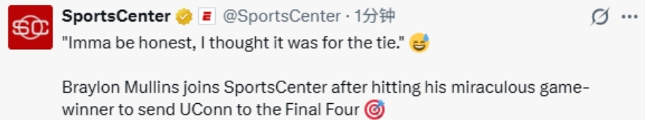 北京时间3月30日,康涅狄格大学在NCAA8强战中依靠穆林斯的三分球绝杀,73-72淘汰杜克大学。赛后,穆林斯接受媒体采访。