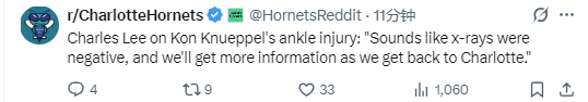 查尔斯-李在谈到克努佩尔的情况时说道:“X光检查结果显示为阴性,返回夏洛特后我们将了解更多情况。但我很欣赏他为球队做出的贡献,在他离场前,我们很需要他拿下的这16分。”