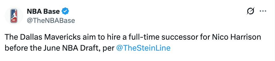 北京时间3月31日,据名记Stein报道,达拉斯独行侠队计划在6月NBA选秀大会前,聘请一位全职高管来接替尼科-哈里森的职位。