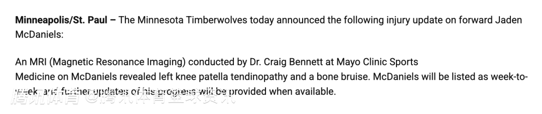 北京时间3月31日,森林狼官方发布伤病报告,球队前锋麦克丹尼尔斯经核磁共振检查确诊为左膝髌腱炎并伴有骨挫伤,他将被列入每日观察名单(一周一评估),后续康复进展将在有消息时同步更新。