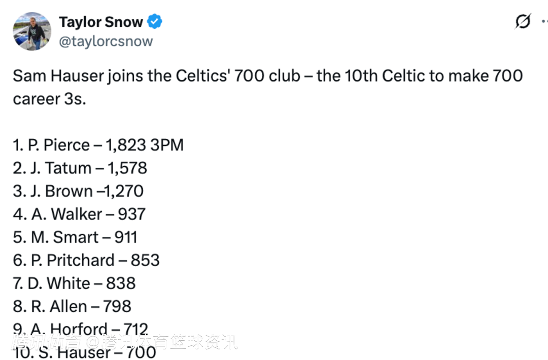 北京时间3月31日,NBA常规赛,凯尔特人对阵老鹰,本场比赛豪瑟达成三分球里程碑,成为绿军队史上第十位投中700个三分球的球员。