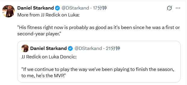 雷迪克表示:“如果我们以现在的状态打完剩余赛季,那东契奇理应拿到MVP。但大家有时候会有近期表现偏见,也会只盯着赛季某一段表现来看。其实整个赛季里,他已经有两三个阶段都打出了MVP级别的表现。他现在的身体状态,大概是他生涯前一两年后最好的一次。”