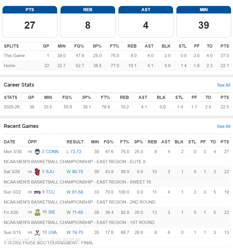 在NCCA疯狂三月精英八强赛中,卡梅隆-布泽尔全场比赛39分钟,21中10,三分4中1,拿到27分8篮板4助攻4失误2盖帽,命中率47.6%。但杜克大学在终场前6.5秒领先2分还手握球权的情况下,卡梅隆的弟弟凯登传球失误,最终康大的马林斯超远三分绝杀。