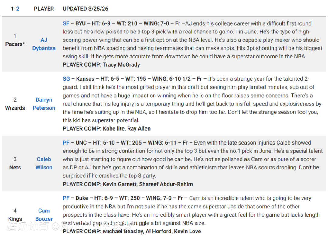 而在DX的预测上,布泽尔的预测顺位是第四,最终是由国王选中他。状元的人选都是杨百翰大学的迪班萨,看起来四号位的布泽尔被看衰前景。