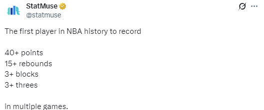 单场41分是文班亚马本赛季单场最高分,此役他状态火热,仅用8分40秒就砍下两双,创造了NBA历史最快两双纪录。文班亚马还是NBA历史上首位多次单场砍下至少40分15篮板3盖帽且命中3+三分球的球员。此外,文班亚马此役出战31分钟砍下至少40分15篮板3盖帽,这是他生涯第2次做到这点,也是NBA唯一能多次做到这点的球员(浓眉和艾伦曾各自做到过1次)。