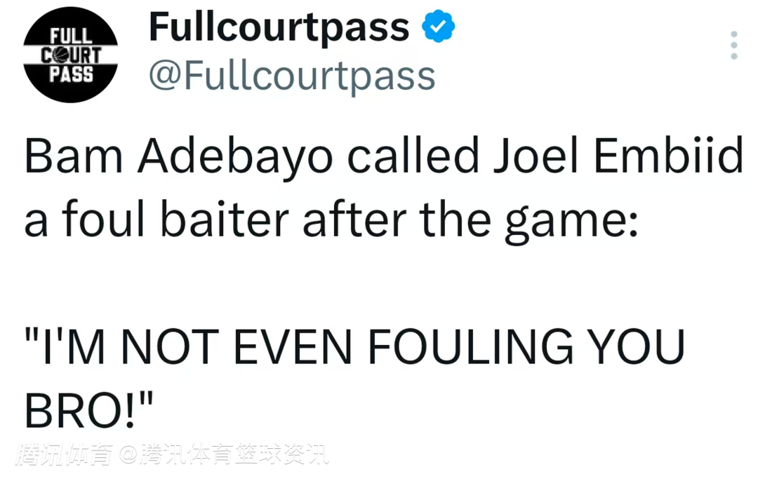 比赛中,恩比德曾犯规不慎单手“扼”住阿德巴约喉咙,裁判吹罚为普通犯规。阿德巴约赛后在场边和恩比德相互交流,打趣恩比德为碰瓷型球员:“我根本就没碰你啊兄弟!”