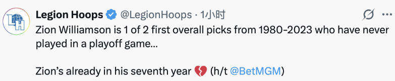 锡安在2019年作为状元被鹈鹕队选中,他已经征战了7个赛季。值得一提的是,鹈鹕队曾在2023-24赛季打入过季后赛,锡安在那个赛季曾出战70场常规赛,但在与湖人队的附加赛中遭遇腿筋伤势,导致他缺席了那一年的季后赛。