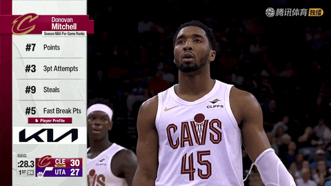 第二节压哨时,米切尔突破打板抛投命中,骑士带着63-53领先进入半场。