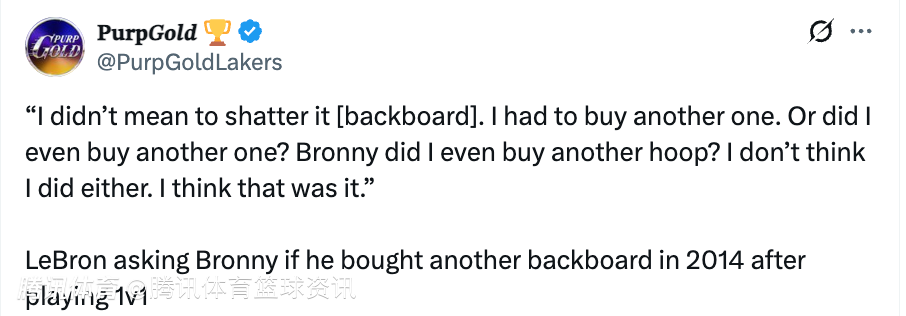 此前布朗尼在接受采访时曾表示,自己和老爹单挑时,老詹把篮板打碎了,对此詹姆斯也回应道:“对,我们家车道上有个篮筐。我突破过了他,然后扣了个篮。我不是故意要扣碎篮板的,但没错,我就是把它扣碎了。”
