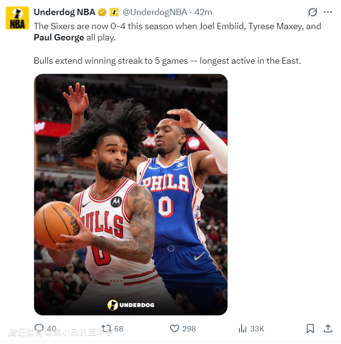 最为惨烈的地方,费城三巨头合体时费城76人本赛季是4负0胜:马克西、恩比德、乔治都在时费城居然一场胜利都没有。公牛则拿到五连胜他们的胜率也再度升至五成。