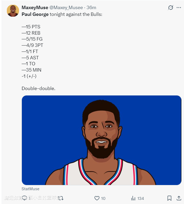 决胜时刻马克西、埃奇库姆、恩比德三人是连续不中,保罗-乔治在最后2分31秒里并没有出手,按理说乔治不该背锅,但大家看看乔治的整体效率35分钟,15中5,命中率只有33.3%,真的不背锅吗?