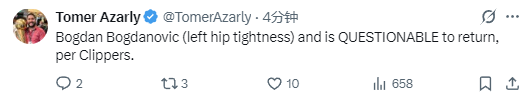 北京时间12月27日,NBA常规赛继续进行,快船队对阵开拓者队。在第二节比赛中,快船队官方宣布,博格达诺维奇出现左侧髋部紧绷症状,本场比赛回归存疑。