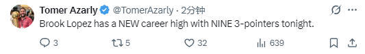 除此之外,大洛佩兹在三分线外已经13投9中,单场命中9记三分球,也创造了生涯新高。