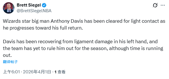 北京时间4月1日,据记者Brett Siegel报道,奇才球星安东尼-戴维斯已获准进行轻度对抗训练,为全面复出稳步推进。戴维斯因左手韧带损伤持续恢复,尽管所剩时间已不多,但球队尚未宣布他赛季报销。