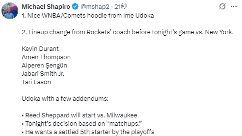 乌度卡补充表示,谢泼德将在对阵雄鹿的比赛中首发,今晚的排兵布阵是基于“对位情况”决定的,他希望在季后赛前确定一个固定的第五首发人选。