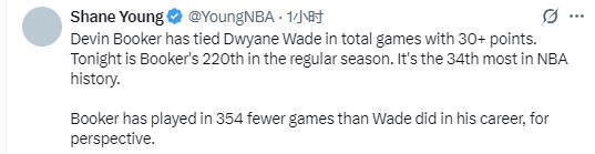 根据数据统计显示,这是布克职业生涯第220次单场砍下30+,追平前NBA球星韦德,排在NBA历史第34位。赛后,布克接受媒体采访,表示“这是一场我们必须要赢下的比赛。”
