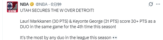 根据数据统计显示,这是乔治和马尔卡宁本赛季第4次同场砍下30+,这一数据位居联盟本赛季所有双人组合之首。此外,这是乔治本赛季第8次单场30+,在所有控球后卫中排名第6位。
