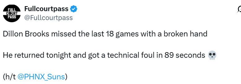 太阳对阵魔术的比赛开场仅89秒,狄龙就被吹了一个技术犯规。狄龙本赛季技犯总数已达到17次。若再领到一次,他将被自动禁赛一场。