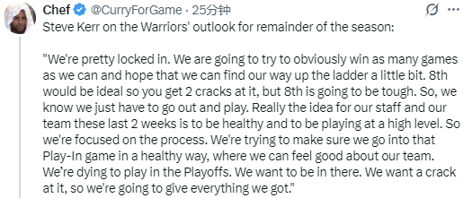 北京时间4月1日,勇士队主教练科尔接受媒体采访,表示勇士队要争取拿到西部第8,这样在附加赛中就能有两次晋级机会。