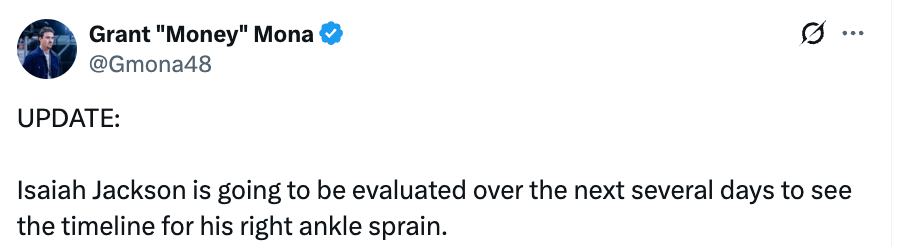北京时间4月1日,快船官方宣布,以赛亚-杰克逊右脚踝扭伤,将在未来几天接受评估,以确定恢复时间表。