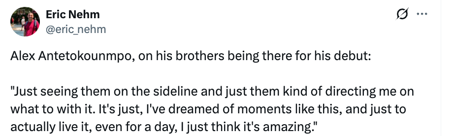 亚历克斯表示:“梦想成真了。说实话,当我被替换上场时,我忍不住环顾四周。作为一个在密尔沃基长大的孩子,这种感觉太不真实了。我看过的雄鹿比赛多到数不清,所以今天能穿上这身球衣上场,真的太不可思议了。”