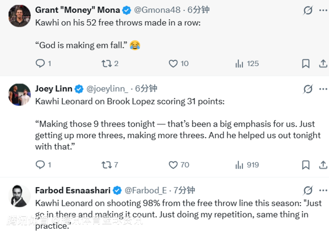 当被问及大洛今晚得到31分一事,莱昂纳德表示:“他今晚投进了9记三分,而增加三分出手、提升三分命中率正是我们重点强调的方向。他今晚的表现帮了我们大忙。”