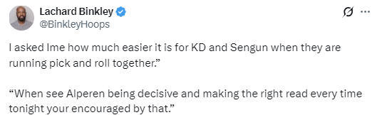 在谈到杜兰特和申京的配合时,乌度卡说道:“他们一整个赛季都在打磨这个配合。对手必须做出选择,夹击杜兰特就会给申京留出机会,换防后又会出现错位。他们很清楚谁在对位上占优势。当然对手也会试图破解,我们也需要继续提升应对夹击的能力,在罚球线区域做出正确判断。今晚他的处理非常果断,这让人很受鼓舞。我们会适当使用这套打法,但不会过度依赖。我们还有其他球员可以支配球,对手尝试用不同方式防守,而我们有三名球员可以发起挡拆,这会让对手很难应对。”