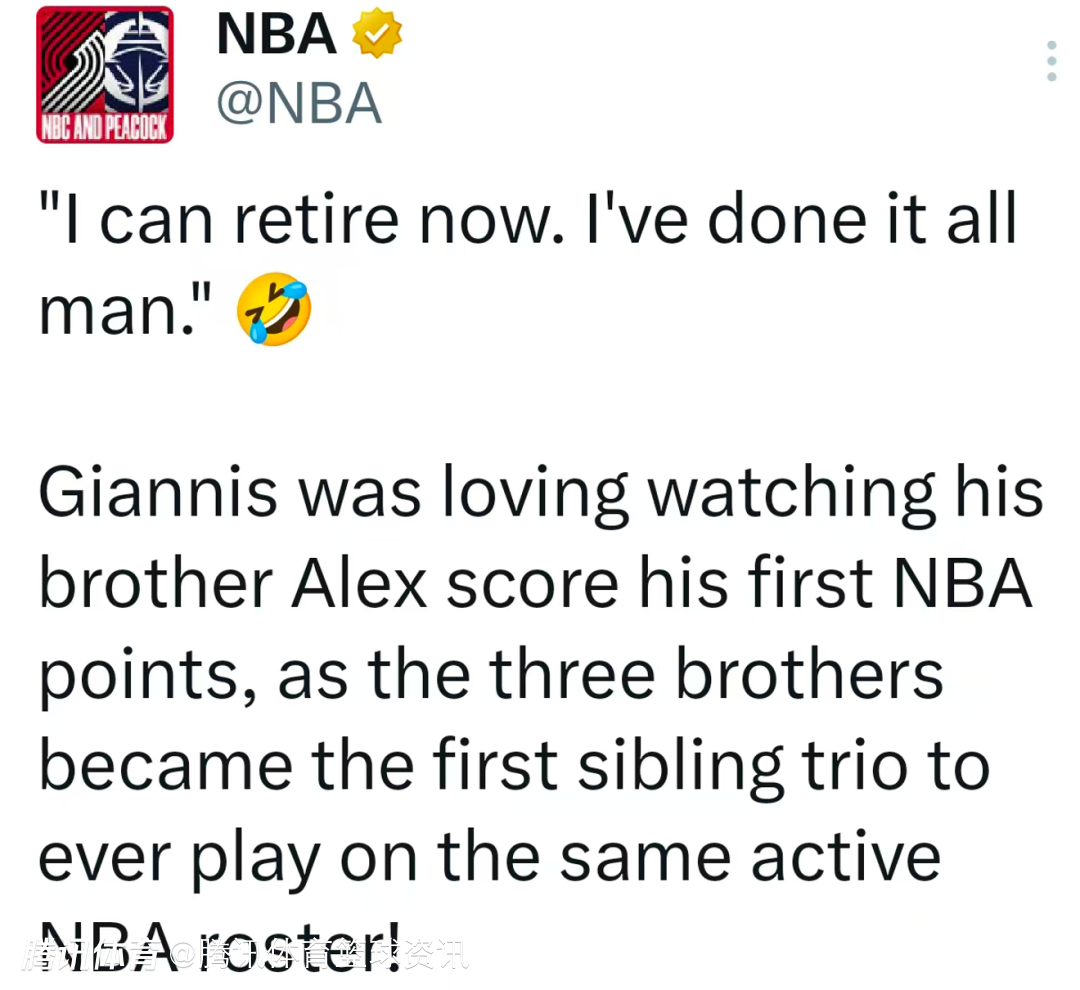 字母哥在看着弟弟亚历克斯打进NBA生涯首分,开心得不行,大喊:“我现在可以退役了,我啥都经历过了。”而这三兄弟也成为了NBA历史上首个同在一支球队阵容的现役亲兄弟三人组!