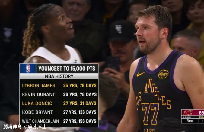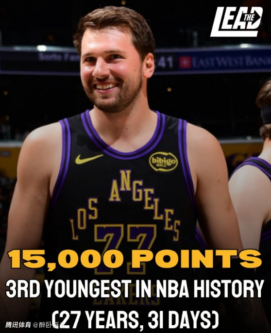 2、东契奇27岁31天超越科比(27岁136天),创造历史第3年轻15000分纪录,仅次于詹姆斯(25岁79天)、杜兰特(26岁78天)。