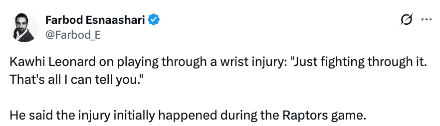 谈及自己带伤出战(手腕有伤),小卡表示:“这处伤势最初是在对阵猛龙的比赛中造成的,就是硬扛着打而已,我只能说这么多了。”