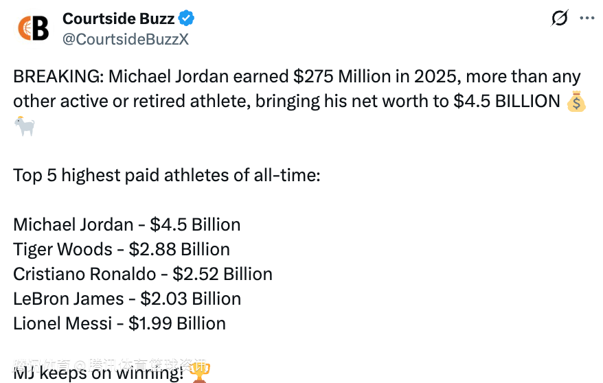 北京时间4月2日,据美媒CourtsideBuzz报道,迈克尔-乔丹2025年收入达2.75亿美元,超过所有现役及退役运动员,净资产升至45亿美元。