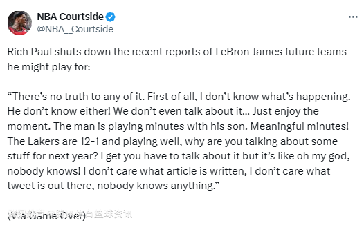 里奇-保罗直接否认了相关报道:“这些消息完全不属实。首先,我自己都不知道后续会怎样,詹姆斯也不清楚,我们甚至都没聊过这件事…… 不如先好好享受当下。他正和儿子同场竞技,一起度过很有意义的比赛时光。湖人现在12胜1负,状态这么出色,为什么非要去讨论明年的计划?我知道媒体总要聊这些话题,但说实话,没人知道答案。不管是谁写的报道、谁发的推文,都不代表真实情况,没人能确定未来会发生什么。”