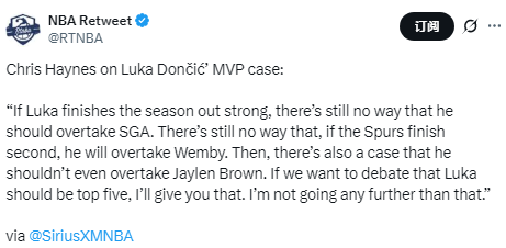 Haynes表示:“就算东契奇后半赛季表现强势,他也绝无可能超越亚历山大。如果马刺最终位列西部第二,他也不可能压过文班亚马。甚至还有观点认为,他连杰伦-布朗都超不过。如果大家要争论东契奇能否进入前五,这点我可以认同。除此之外,我不会再做更高评价。”