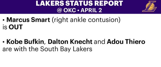 北京时间4月2日,NBA常规赛继续进行,湖人明日对阵雷霆。赛前,湖人方面更新球队本场比赛伤病报告,斯马特确定缺席。