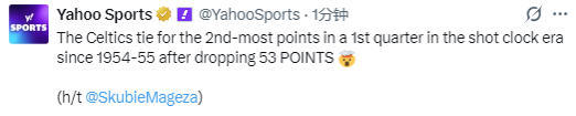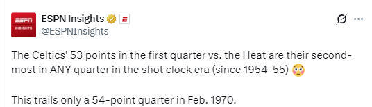 根据数据统计显示,首节能砍下53分,是NBA在1954-55赛季引入进攻计时钟以来,历史上并列第二高的首节得分。值得一提的是,另外一支能在首节轰下53分的球队,正是凯尔特人队今天的对手热火队,他们曾在本赛季对阵黄蜂队的比赛中,首节轰下53分。首节历史最高分则归属于2023年的勇士队,他们曾在对阵开拓者队的比赛中首节轰下55分。