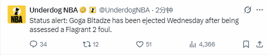 北京时间4月2日,NBA常规赛继续进行,魔术队101-130不敌老鹰队。本场比赛进行到第四节,魔术队球员比塔泽因从身后掀翻兰代尔,被吹罚二级恶意犯规,遭到驱逐。