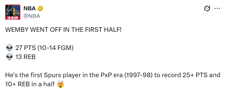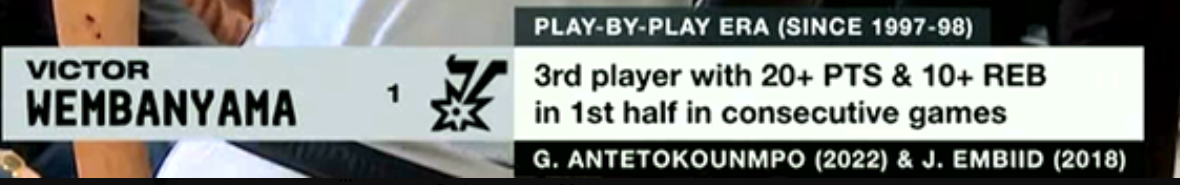 根据数据统计显示,文班亚马是1997-98赛季实况转播时代以来,马刺队首位单个半场砍下至少25分10篮板的球员。此外,他还是1997-98赛季实况转播时代以来,第三位能在上半场多次砍下至少20分10篮板的球员,另外两人分别是2018年的恩比德与2022年的字母哥。