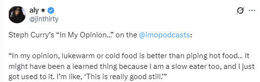 库里说道:“在我看来,温热的食物或者放凉的食物,比滚烫刚出锅的更好吃,这可能是后天养成的习惯,因为我吃饭的速度很慢,慢慢就习惯了。我就觉得,这样吃味道依然很棒。”