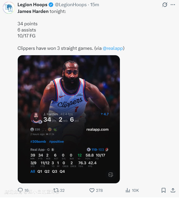 进入最后3分04秒,哈登突破命中、三分命中、两罚命中,换言之是连拿7分帮助快船锁定胜局,末节哈登4中3+三分2中1+罚球4中4拿到11分1篮板1助攻,这个表现真的太出色了。