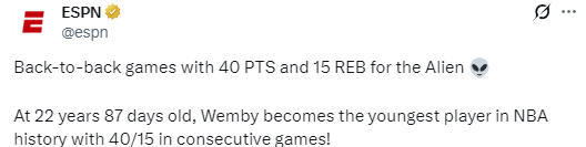 这是文班亚马职业生涯首次连续两场比赛砍下40+,他也成为了马刺队史第三位做到这点的球员,仅次于“冰人”乔治-格文和罗恩-布鲁尔。此外,文班亚马还是马刺队史首位连续两场能砍下40+两双的球员,还是NBA历史上连续两场砍下至少40分15篮板的最年轻球员(22岁87天)。他已经连续5场比赛至少15分15篮板,超越大卫-罗宾逊和邓肯,升至马刺队史第一。