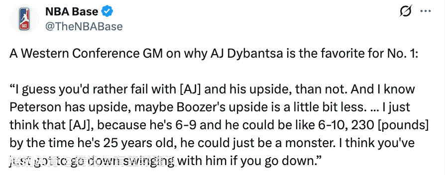 该总经理表示:“我觉得,你宁愿赌一把AJ的天赋上限,哪怕最后失败,也不想错过他。我知道彼得森也有潜力,但布泽尔的天花板可能就要低一些……在我看来,AJ现在身高6英尺9英寸(约2.06米),到25岁时,他可能会长到6英尺10英寸(约2.08米)、体重230磅(约104公斤),完全有成长为怪物级球员的潜力。就算最后赌输了,也得是‘拼尽全力地和他一起倒下’,这才值得。”