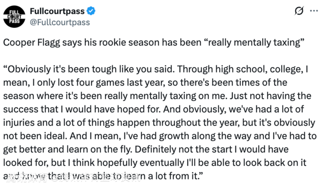 北京时间4月3日,近期,弗拉格在做客节目时坦言,自己的新秀赛季精神压力极大。