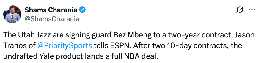 北京时间4月3日,据名记Shams报道,爵士将和后卫贝兹-姆本签下一份2年合同,这位来自耶鲁大学的落选秀,在签了两份10天短合同后,终于拿到了正式的NBA合同。