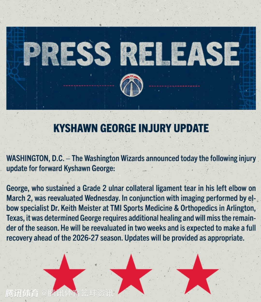 北京时间4月3日,奇才官方宣布,凯肖恩-乔治左肘尺侧副韧带二级撕裂,赛季报销。