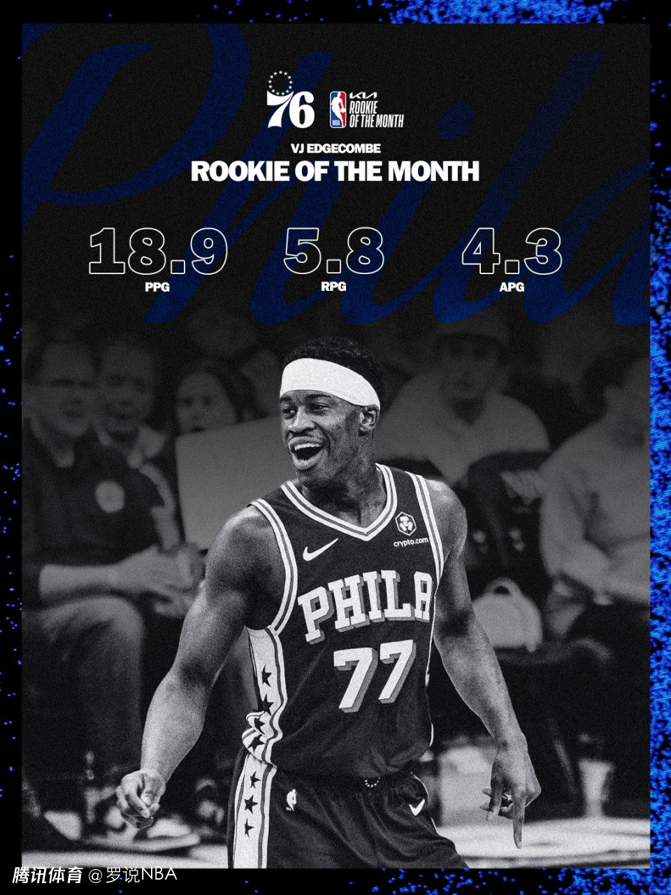 76人后卫VJ-埃奇库姆当选东部3月最佳新秀,埃奇库姆的当选,终结了黄蜂锋线康-克努佩尔本赛季包揽东部全部月最佳新秀的势头。克努佩尔此前已拿下10/11月、12月、1月及2月的东部月最佳新秀。