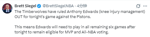 这也意味着,爱德华兹必须出战本场之后剩余的全部6场常规赛,才能保留参与MVP及NBA最佳阵容评选的资格。