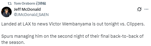 北京时间4月3日,NBA常规赛继续进行,马刺对阵快船。赛前,马刺队记Jeff McDonald发推表示,刚抵达洛杉矶国际机场,就得知文班亚马将缺席今天对阵快船的比赛。