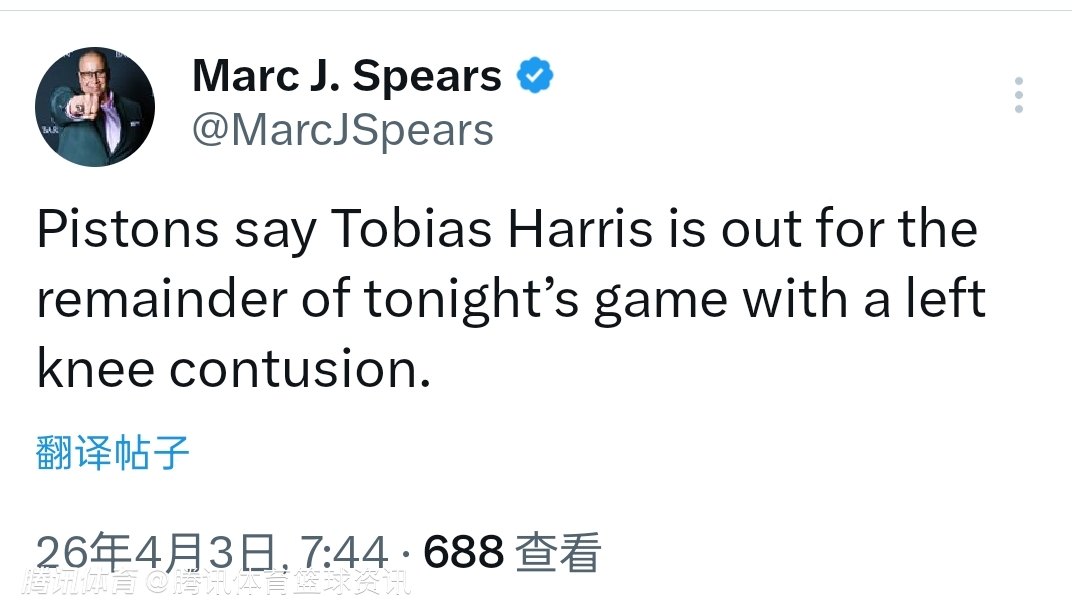 北京时间4月3日,NBA常规赛继续进行,活塞对阵森林狼。活塞球员哈里斯首发出战。比赛进行至第二节,哈里斯在空中对抗后落地腿部受伤,返回更衣室治疗。随后,活塞官方宣布,哈里斯因左膝挫伤,本场比赛不会回归。